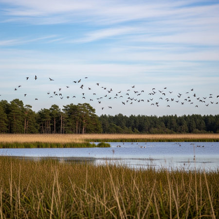wetlands with busy community of birds, insects and other animals, created with generative ai