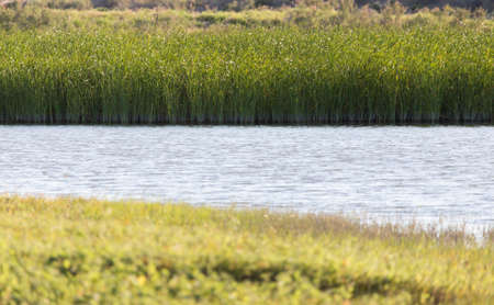 a picture of the shore with reeds and water, a landscape photo on a summer day on the shore of a pond, a lake or a river in a photo