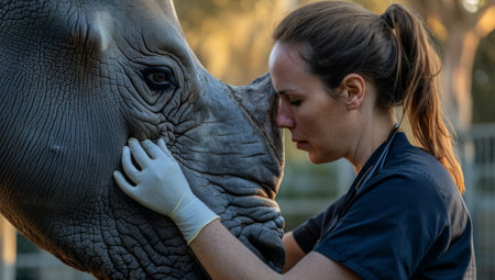 In the depths of a wildlife sanctuary, a profound bond unfolds between a compassionate veterinarian and an orphaned rhino Their daily encounters are captured in heartwarming images depicting the trust, care, and love that unite them in their shared journey for the animal's well-being AI Generative