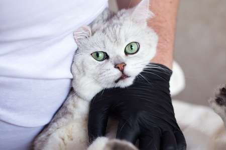 A beautiful gray cat in the hands of a veterinarian. Scottish fold cat at a reception in a veterinary clinic. A veterinarian examines a gray cat.