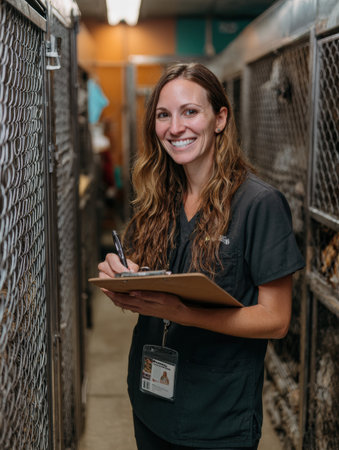 Veterinarian stands next to animal cages holding a clipboard and smiling, showcasing a friendly and professional demeanor in a veterinary clinic.