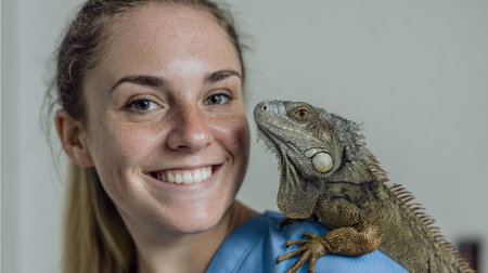 A vet assistant beams joyfully while holding an iguana on her shoulder in a bright, relaxed clinic setting. The atmosphere is warm and friendly.