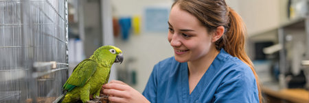 A vet assistant engages happily with a parrot, fostering a playful interaction in a well-lit clinic. The atmosphere is friendly and professional.