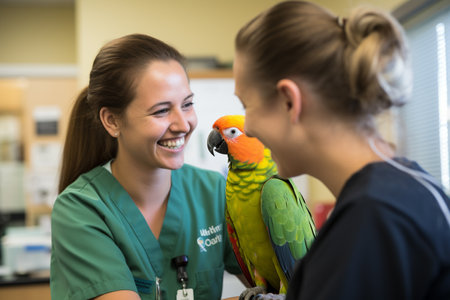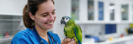 Vet assistant smiles while playing with a colorful parrot in a bright and open clinic corner, highlighting a warm and cheerful atmosphere during work hours.