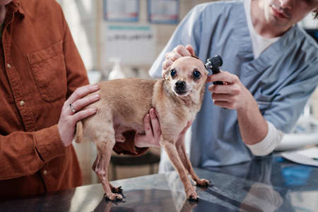 Vet doctor examining the ears of little dog with medical equipment with the owner holding its on the table in vet clinic