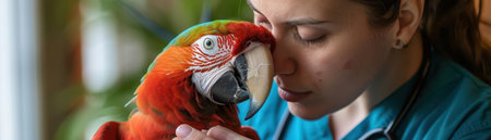 A caring interaction between a veterinarian and a colorful parrot, highlighting the bond and compassion in animal care.