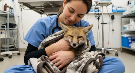 Wildlife volunteer caring for an orphaned fawn, gently bottle feeding milk in a serene forest setting, promoting compassion and conservation
