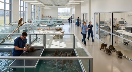 A spacious, modern wildlife rehabilitation center or veterinary hospital with large glass enclosures. Veterinarians and staff are busy caring for various animals, including otters in a pool, raccoons, and a hawk, in a bright, clean facility.