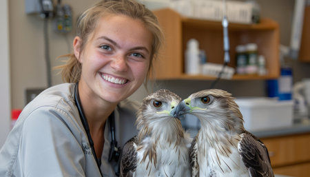 Capture the captivating image of a dedicated wildlife veterinarian, her face beaming with compassion as she lovingly tends to two majestic falcons in her care The birds perch gracefully on her arms, their keen eyes reflecting the bond they share with their protector This heartwarming scene showcases the selfless dedication of those who devote their lives to the well-being of animals in need AI Generative