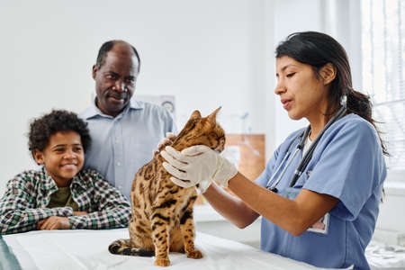 Joyful African American man and his son watching Hispanic doctor palpating their bengal cat during medical check-up