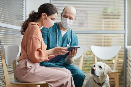 Side view portrait of young woman wearing mask while talking to veterinarian in waiting room at vet clinic with white dog, copy space