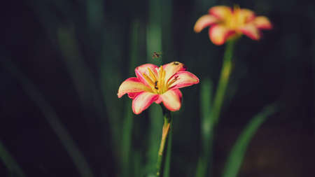 Pink rain lily zephyranthes flower blooms. Closeup natural view of pink flower with green dark leave.