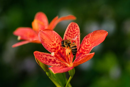 Honey bee collecting pollen from red lily flower in the garden