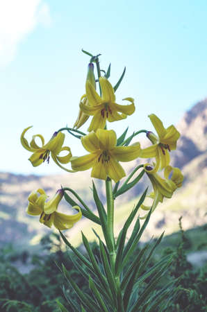 A beautiful yellow lily grows in the Caucasus mountains. Close up.