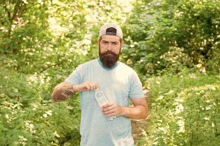 mature bearded man with beard in summer clothes open water bottle in forest, after training