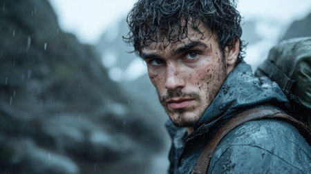 Portrait of a young, bearded man, on, against a background of wildlife. The concept of expedition, adventure and camping life.