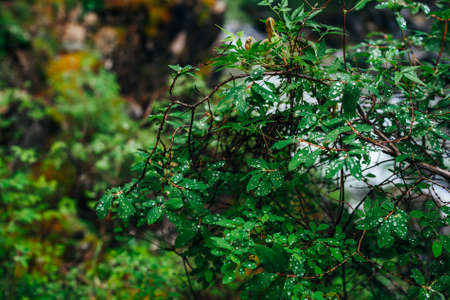 Beautiful wild flora in dark forest. Green leaves of small tree with droplets. Atmospheric taiga background of fresh greenery with drops close-up. Scenic woodland vivid backdrop with wet green foliage