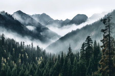 A captivating misty forest scene showcasing evergreen trees amidst a breathtaking mountain backdrop, evoking a sense of tranquility and natural beauty.