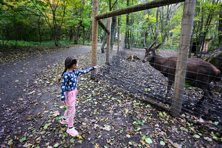 little girl feeds a deer in the zoo on a warm autumn day.