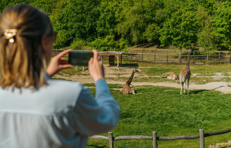 Woman taking photo of giraffes at zoo.