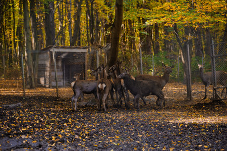 A herd of deer in the forest, yellow leaves in the background. Deer running in the forest
