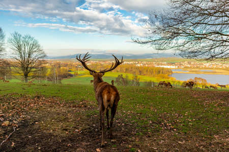 Deer and its herd on the meadow