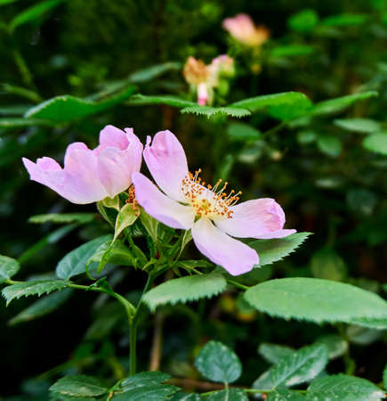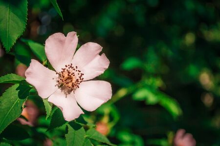 Dog rose in nature, blooming soft pink flower. Wild rose.