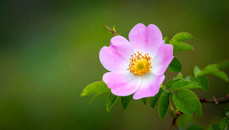 A single pink wild rose with yellow stamens is in sharp focus against a soft green bokeh background.