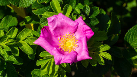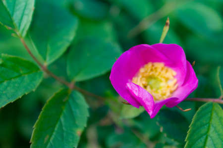 Purple dog-rose aka rosa canina flower among green leaves. spring season. nature beauty. Blurred background