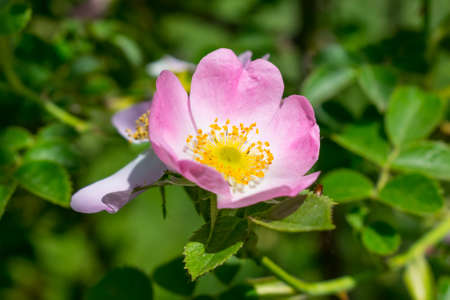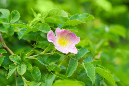 beautiful flower of wild rose or rosehip close-up against the background of green leaves