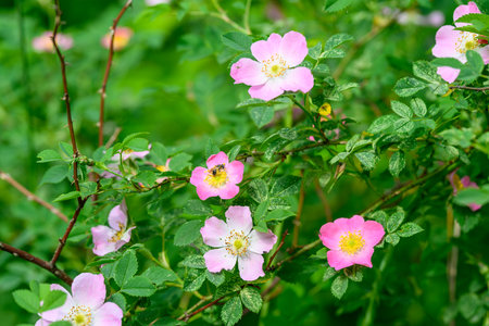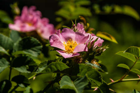 Blossom pink flowers of prickly wild rose shrub, Dog Rose, in coniferous forest at spring summer time, floral season, organic plants in traditional medicine, front selective focus