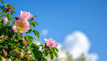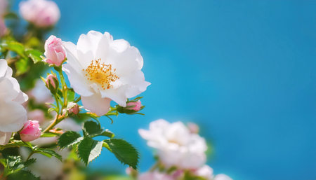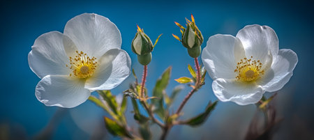 White Dog Rose Flowers with Orange Centers, Green Leaves, and Buds against a Blue Sky