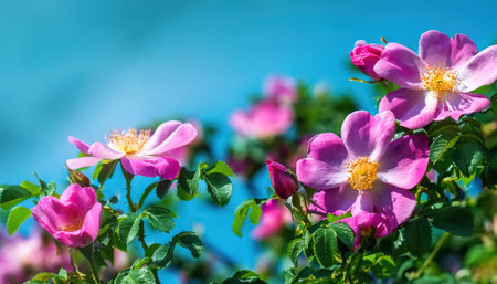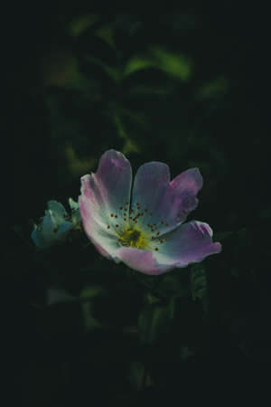 Wild rose flowers blooming in the garden at sunset. Natural floral background.
