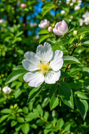 Wild White Roses in Bloom Nature s Elegance with Lush Green Foliage, Unopened Buds, and Azure Sky