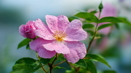 Beautiful pink rosehip flowers with drops of dew on the petals.