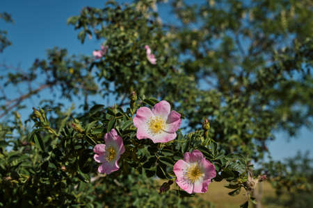 Dog rose Rosa canina light pink flowers in bloom on branches, beautiful wild flowering shrub, green leaves. wild rose plant.