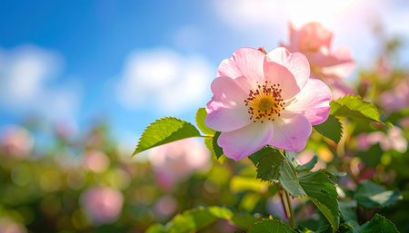 Delicate Wild Rose in Sunlight with Green Leaves and Buds