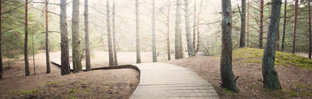 A wooden footpath through the old pine trees. Moss on the ground. Sun rays and morning fog through the tree trunks. Dark forest scene. Latvia
