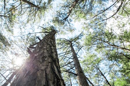 Many Pine trees going up in forest with sunrise.Copy space in middle.