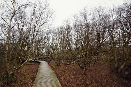 Boardwalk, path, or wooden plank bridge between trees and shrubs in the Vogelkoje area, Amrum, North Frisian Islands, Schleswig-Holstein, Germany