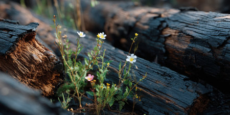 Wildflower growing among charred logs in forest with soft natural light creating peaceful mood