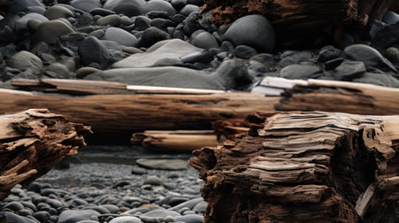 Tranquil beach with weathered driftwood along the sandy shore at twilight