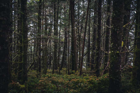 Dark forest, tall old evergreen pines