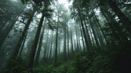 Enchanting view of a dense forest featuring towering trees shrouded in mist, creating a serene atmosphere perfect for nature lovers and outdoor enthusiasts.