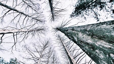 Gracefull pine trees in a forest. Nature background for posters, blogs and web design. Black and white