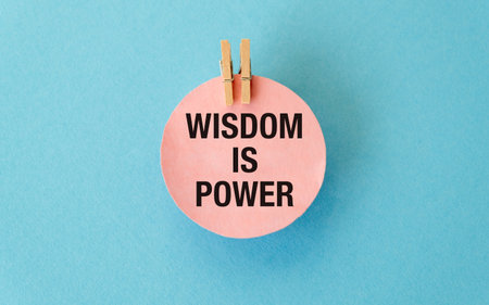 A pink sign that says Wisdom is Power. It is hanging from a clothespin. The sign is on a blue background