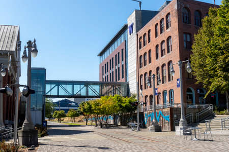 Tacoma, WA USA - circa August 2021: View of the large city campus at the University of Washington Tacoma on a sunny, cloudless day.