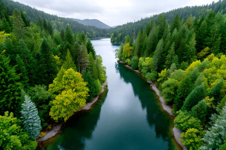 This image depicts a river flowing through a forested valley. The scene features lush green trees and a tranquil watercourse under a misty atmosphere. The composition includes natural elements, creating a serene and captivating environment. Suitable for various editorial and commercial applications.