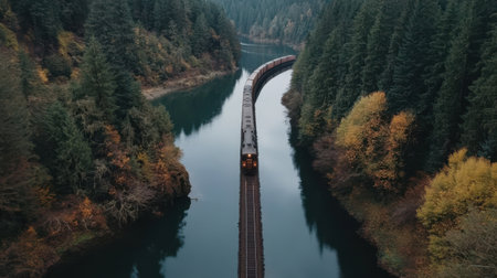 A train navigates a narrow bridge, gracefully crossing a river. Lush green forests envelop the landscape, highlighting the beauty of nature during a tranquil day.