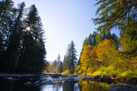 Fascinating autumn landscape mountain river with sky reflection in the water among the stones with the sun shines through the silhouette of high oil, and covering the yellowed and burning golden autumn trees